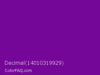 Decimal 14010319929 Color is a normal purple color and the nearest color is Purple #660099. Hex code #740797 and RGB value is rgb(116,7,151). In RGB color space, this color is composed of 45% red, 3% green, 59% blue, In CMYK color space, this color is composed of 23% cyan, 95% magenta, 0% yellow , 41% black , In HSL color space, this color has a hue angle of 285° , 91% saturation and 31% lightness.