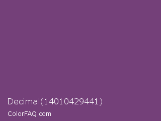 Decimal 14010429441 Color is a normal magenta color and the nearest color is Maximum Purple #733380. Hex code #744079 and RGB value is rgb(116,64,121). In RGB color space, this color is composed of 45% red, 25% green, 47% blue, In CMYK color space, this color is composed of 4% cyan, 47% magenta, 0% yellow , 53% black , In HSL color space, this color has a hue angle of 295° , 31% saturation and 36% lightness.