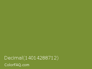 Decimal 14014288712 Color is a normal lime color and the nearest color is Wasabi #788a25. Hex code #799134 and RGB value is rgb(121,145,52). In RGB color space, this color is composed of 47% red, 57% green, 20% blue, In CMYK color space, this color is composed of 17% cyan, 0% magenta, 64% yellow , 43% black , In HSL color space, this color has a hue angle of 75° , 47% saturation and 39% lightness.