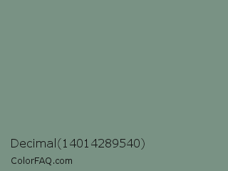 Decimal 14014289540 Color is a normal green color and the nearest color is Dolphin Gray #828e84. Hex code #799284 and RGB value is rgb(121,146,132). In RGB color space, this color is composed of 47% red, 57% green, 52% blue, In CMYK color space, this color is composed of 17% cyan, 0% magenta, 10% yellow , 43% black , In HSL color space, this color has a hue angle of 146° , 10% saturation and 52% lightness.