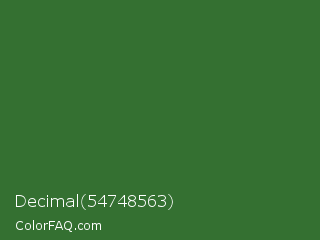 Decimal 54748563 Color is a normal green color and the nearest color is Mughal Green #306030. Hex code #347031 and RGB value is rgb(52,112,49). In RGB color space, this color is composed of 20% red, 44% green, 19% blue, In CMYK color space, this color is composed of 54% cyan, 0% magenta, 56% yellow , 56% black , In HSL color space, this color has a hue angle of 117° , 39% saturation and 32% lightness.