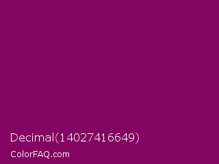 Decimal 14027416649 Color is a dark magenta color and the nearest color is Cardinal Pink #8c055e. Hex code #840561 and RGB value is rgb(132,5,97). In RGB color space, this color is composed of 52% red, 2% green, 38% blue, In CMYK color space, this color is composed of 0% cyan, 96% magenta, 27% yellow , 48% black , In HSL color space, this color has a hue angle of 317° , 93% saturation and 27% lightness.