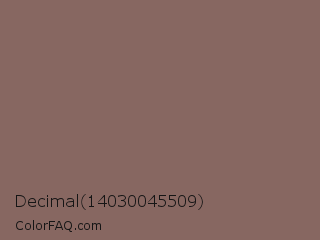 Decimal 14030045509 Color is a normal red color and the nearest color is Sand Dune #826f65. Hex code #876761 and RGB value is rgb(135,103,97). In RGB color space, this color is composed of 53% red, 40% green, 38% blue, In CMYK color space, this color is composed of 0% cyan, 24% magenta, 28% yellow , 47% black , In HSL color space, this color has a hue angle of 9° , 16% saturation and 45% lightness.