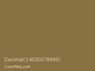 Decimal 14030078999 Color is a normal orange color and the nearest color is Raw Umber #826644. Hex code #877041 and RGB value is rgb(135,112,65). In RGB color space, this color is composed of 53% red, 44% green, 25% blue, In CMYK color space, this color is composed of 0% cyan, 17% magenta, 52% yellow , 47% black , In HSL color space, this color has a hue angle of 40° , 35% saturation and 39% lightness.