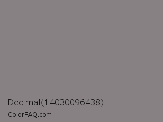 Decimal 14030096438 Color is a normal rose color and the nearest color is Suva Gray #888387. Hex code #878184 and RGB value is rgb(135,129,132). In RGB color space, this color is composed of 53% red, 51% green, 52% blue, In CMYK color space, this color is composed of 0% cyan, 4% magenta, 2% yellow , 47% black , In HSL color space, this color has a hue angle of 330° , 2% saturation and 52% lightness.