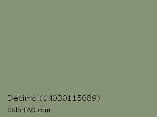Decimal 14030115889 Color is a normal green color and the nearest color is Battleship Gray #828f72. Hex code #879377 and RGB value is rgb(135,147,119). In RGB color space, this color is composed of 53% red, 58% green, 47% blue, In CMYK color space, this color is composed of 8% cyan, 0% magenta, 19% yellow , 42% black , In HSL color space, this color has a hue angle of 86° , 11% saturation and 52% lightness.