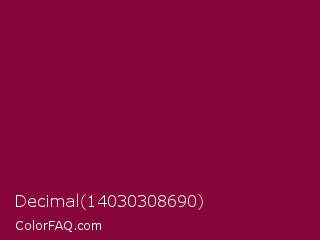 Decimal 14030308690 Color is a dark rose color and the nearest color is Siren #7a013a. Hex code #880538 and RGB value is rgb(136,5,56). In RGB color space, this color is composed of 53% red, 2% green, 22% blue, In CMYK color space, this color is composed of 0% cyan, 96% magenta, 59% yellow , 47% black , In HSL color space, this color has a hue angle of 337° , 93% saturation and 28% lightness.