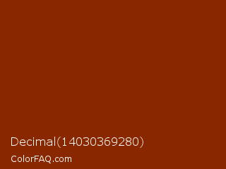 Decimal 14030369280 Color is a dark orange color and the nearest color is Smokey Topaz #832a0d. Hex code #882700 and RGB value is rgb(136,39,0). In RGB color space, this color is composed of 53% red, 15% green, 0% blue, In CMYK color space, this color is composed of 0% cyan, 71% magenta, 100% yellow , 47% black , In HSL color space, this color has a hue angle of 17° , 100% saturation and 27% lightness.