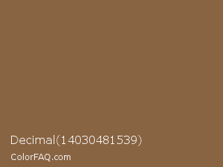 Decimal 14030481539 Color is a normal orange color and the nearest color is Raw Umber #826644. Hex code #886443 and RGB value is rgb(136,100,67). In RGB color space, this color is composed of 53% red, 39% green, 26% blue, In CMYK color space, this color is composed of 0% cyan, 26% magenta, 51% yellow , 47% black , In HSL color space, this color has a hue angle of 29° , 34% saturation and 40% lightness.