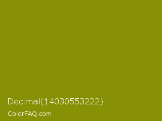 Decimal 14030553222 Color is a dark yellow color and the nearest color is Olive #808000. Hex code #889006 and RGB value is rgb(136,144,6). In RGB color space, this color is composed of 53% red, 56% green, 2% blue, In CMYK color space, this color is composed of 6% cyan, 0% magenta, 96% yellow , 44% black , In HSL color space, this color has a hue angle of 63° , 92% saturation and 29% lightness.