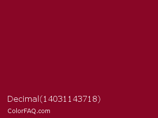 Decimal 14031143718 Color is a dark red color and the nearest color is Monarch #8b0723. Hex code #890626 and RGB value is rgb(137,6,38). In RGB color space, this color is composed of 54% red, 2% green, 15% blue, In CMYK color space, this color is composed of 0% cyan, 96% magenta, 72% yellow , 46% black , In HSL color space, this color has a hue angle of 345° , 92% saturation and 28% lightness.