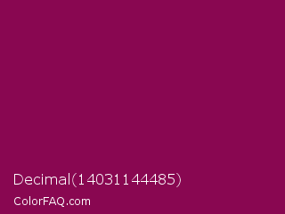 Decimal 14031144485 Color is a dark magenta color and the nearest color is Cardinal Pink #8c055e. Hex code #890751 and RGB value is rgb(137,7,81). In RGB color space, this color is composed of 54% red, 3% green, 32% blue, In CMYK color space, this color is composed of 0% cyan, 95% magenta, 41% yellow , 46% black , In HSL color space, this color has a hue angle of 326° , 90% saturation and 28% lightness.