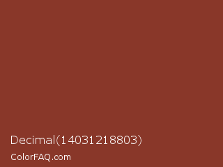 Decimal 14031218803 Color is a normal red color and the nearest color is Burnt Umber #8a3324. Hex code #893729 and RGB value is rgb(137,55,41). In RGB color space, this color is composed of 54% red, 22% green, 16% blue, In CMYK color space, this color is composed of 0% cyan, 60% magenta, 70% yellow , 46% black , In HSL color space, this color has a hue angle of 9° , 54% saturation and 35% lightness.