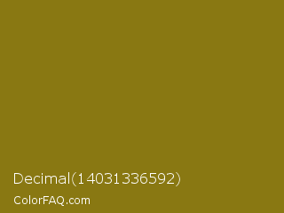 Decimal 14031336592 Color is a dark yellow color and the nearest color is Corn Harvest #8b6b0b. Hex code #897812 and RGB value is rgb(137,120,18). In RGB color space, this color is composed of 54% red, 47% green, 7% blue, In CMYK color space, this color is composed of 0% cyan, 12% magenta, 87% yellow , 46% black , In HSL color space, this color has a hue angle of 51° , 77% saturation and 30% lightness.