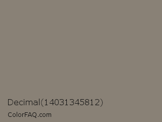Decimal 14031345812 Color is a normal orange color and the nearest color is Squirrel #8f8176. Hex code #898176 and RGB value is rgb(137,129,118). In RGB color space, this color is composed of 54% red, 51% green, 46% blue, In CMYK color space, this color is composed of 0% cyan, 6% magenta, 14% yellow , 46% black , In HSL color space, this color has a hue angle of 35° , 7% saturation and 50% lightness.