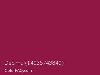 Decimal 14035743840 Color is a normal rose color and the nearest color is Disco #871550. Hex code #901744 and RGB value is rgb(144,23,68). In RGB color space, this color is composed of 56% red, 9% green, 27% blue, In CMYK color space, this color is composed of 0% cyan, 84% magenta, 53% yellow , 44% black , In HSL color space, this color has a hue angle of 338° , 72% saturation and 33% lightness.