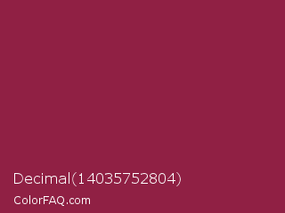 Decimal 14035752804 Color is a normal rose color and the nearest color is Big Dip O Ruby #9c2542. Hex code #902044 and RGB value is rgb(144,32,68). In RGB color space, this color is composed of 56% red, 13% green, 27% blue, In CMYK color space, this color is composed of 0% cyan, 78% magenta, 53% yellow , 44% black , In HSL color space, this color has a hue angle of 341° , 64% saturation and 35% lightness.