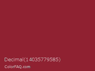 Decimal 14035779585 Color is a normal red color and the nearest color is Antique Ruby #841b2d. Hex code #902131 and RGB value is rgb(144,33,49). In RGB color space, this color is composed of 56% red, 13% green, 19% blue, In CMYK color space, this color is composed of 0% cyan, 77% magenta, 66% yellow , 44% black , In HSL color space, this color has a hue angle of 351° , 63% saturation and 35% lightness.
