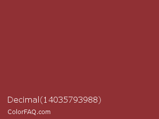 Decimal 14035793988 Color is a normal red color and the nearest color is Stiletto #9c3336. Hex code #903034 and RGB value is rgb(144,48,52). In RGB color space, this color is composed of 56% red, 19% green, 20% blue, In CMYK color space, this color is composed of 0% cyan, 67% magenta, 64% yellow , 44% black , In HSL color space, this color has a hue angle of 358° , 50% saturation and 38% lightness.
