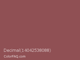 Decimal 14042538088 Color is a normal red color and the nearest color is Rose Taupe #905d5d. Hex code #905054 and RGB value is rgb(144,80,84). In RGB color space, this color is composed of 56% red, 31% green, 33% blue, In CMYK color space, this color is composed of 0% cyan, 44% magenta, 42% yellow , 44% black , In HSL color space, this color has a hue angle of 356° , 29% saturation and 44% lightness.