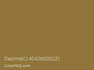 Decimal 14042600022 Color is a normal orange color and the nearest color is Old Moss Green #867e36. Hex code #907438 and RGB value is rgb(144,116,56). In RGB color space, this color is composed of 56% red, 45% green, 22% blue, In CMYK color space, this color is composed of 0% cyan, 19% magenta, 61% yellow , 44% black , In HSL color space, this color has a hue angle of 41° , 44% saturation and 39% lightness.