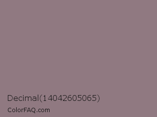 Decimal 14042605065 Color is a normal rose color and the nearest color is Rocket Metallic #8a7f80. Hex code #907981 and RGB value is rgb(144,121,129). In RGB color space, this color is composed of 56% red, 47% green, 51% blue, In CMYK color space, this color is composed of 0% cyan, 16% magenta, 10% yellow , 44% black , In HSL color space, this color has a hue angle of 339° , 9% saturation and 52% lightness.