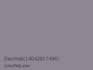 Decimal 14042617496 Color is a normal purple color and the nearest color is Venus #928590. Hex code #908592 and RGB value is rgb(144,133,146). In RGB color space, this color is composed of 56% red, 52% green, 57% blue, In CMYK color space, this color is composed of 1% cyan, 9% magenta, 0% yellow , 43% black , In HSL color space, this color has a hue angle of 291° , 6% saturation and 55% lightness.