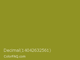 Decimal 14042632561 Color is a normal yellow color and the nearest color is Hacienda #98811b. Hex code #909323 and RGB value is rgb(144,147,35). In RGB color space, this color is composed of 56% red, 58% green, 14% blue, In CMYK color space, this color is composed of 2% cyan, 0% magenta, 76% yellow , 42% black , In HSL color space, this color has a hue angle of 62° , 62% saturation and 36% lightness.