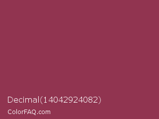 Decimal 14042924082 Color is a normal rose color and the nearest color is Camelot #893456. Hex code #913450 and RGB value is rgb(145,52,80). In RGB color space, this color is composed of 57% red, 20% green, 31% blue, In CMYK color space, this color is composed of 0% cyan, 64% magenta, 45% yellow , 43% black , In HSL color space, this color has a hue angle of 342° , 47% saturation and 39% lightness.