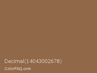 Decimal 14043002678 Color is a normal orange color and the nearest color is Dark Brown Tangelo #88654e. Hex code #916848 and RGB value is rgb(145,104,72). In RGB color space, this color is composed of 57% red, 41% green, 28% blue, In CMYK color space, this color is composed of 0% cyan, 28% magenta, 50% yellow , 43% black , In HSL color space, this color has a hue angle of 26° , 34% saturation and 43% lightness.