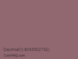 Decimal 14043002742 Color is a normal red color and the nearest color is Opium #8e6f70. Hex code #916870 and RGB value is rgb(145,104,112). In RGB color space, this color is composed of 57% red, 41% green, 44% blue, In CMYK color space, this color is composed of 0% cyan, 28% magenta, 23% yellow , 43% black , In HSL color space, this color has a hue angle of 348° , 16% saturation and 49% lightness.