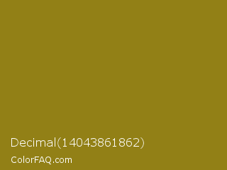 Decimal 14043861862 Color is a normal yellow color and the nearest color is Hacienda #98811b. Hex code #928016 and RGB value is rgb(146,128,22). In RGB color space, this color is composed of 57% red, 50% green, 9% blue, In CMYK color space, this color is composed of 0% cyan, 12% magenta, 85% yellow , 43% black , In HSL color space, this color has a hue angle of 51° , 74% saturation and 33% lightness.