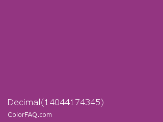 Decimal 14044174345 Color is a normal magenta color and the nearest color is Plum #8e4585. Hex code #933581 and RGB value is rgb(147,53,129). In RGB color space, this color is composed of 58% red, 21% green, 51% blue, In CMYK color space, this color is composed of 0% cyan, 64% magenta, 12% yellow , 42% black , In HSL color space, this color has a hue angle of 311° , 47% saturation and 39% lightness.