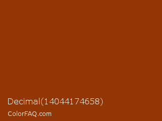 Decimal 14044174658 Color is a dark orange color and the nearest color is Oregon #9b4703. Hex code #933606 and RGB value is rgb(147,54,6). In RGB color space, this color is composed of 58% red, 21% green, 2% blue, In CMYK color space, this color is composed of 0% cyan, 63% magenta, 96% yellow , 42% black , In HSL color space, this color has a hue angle of 20° , 92% saturation and 30% lightness.