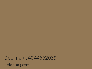 Decimal 14044662039 Color is a normal orange color and the nearest color is Pale Brown #987654. Hex code #937855 and RGB value is rgb(147,120,85). In RGB color space, this color is composed of 58% red, 47% green, 33% blue, In CMYK color space, this color is composed of 0% cyan, 18% magenta, 42% yellow , 42% black , In HSL color space, this color has a hue angle of 34° , 27% saturation and 45% lightness.