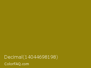 Decimal 14044698198 Color is a dark yellow color and the nearest color is Dark Yellow #9b870c. Hex code #938308 and RGB value is rgb(147,131,8). In RGB color space, this color is composed of 58% red, 51% green, 3% blue, In CMYK color space, this color is composed of 0% cyan, 11% magenta, 95% yellow , 42% black , In HSL color space, this color has a hue angle of 53° , 90% saturation and 30% lightness.