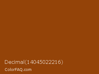 Decimal 14045022216 Color is a normal orange color and the nearest color is Oregon #9b4703. Hex code #944308 and RGB value is rgb(148,67,8). In RGB color space, this color is composed of 58% red, 26% green, 3% blue, In CMYK color space, this color is composed of 0% cyan, 55% magenta, 95% yellow , 42% black , In HSL color space, this color has a hue angle of 25° , 90% saturation and 31% lightness.