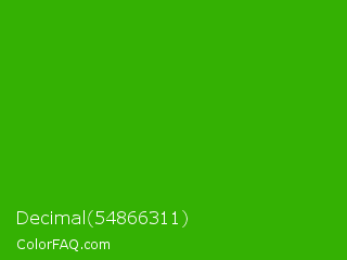 Decimal 54866311 Color is a normal green color and the nearest color is Kelly Green #4cbb17. Hex code #34b103 and RGB value is rgb(52,177,3). In RGB color space, this color is composed of 20% red, 69% green, 1% blue, In CMYK color space, this color is composed of 71% cyan, 0% magenta, 98% yellow , 31% black , In HSL color space, this color has a hue angle of 103° , 97% saturation and 35% lightness.
