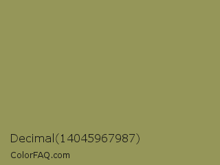 Decimal 14045967987 Color is a normal yellow color and the nearest color is Moss Green #8a9a5b. Hex code #959659 and RGB value is rgb(149,150,89). In RGB color space, this color is composed of 58% red, 59% green, 35% blue, In CMYK color space, this color is composed of 1% cyan, 0% magenta, 41% yellow , 41% black , In HSL color space, this color has a hue angle of 61° , 26% saturation and 47% lightness.