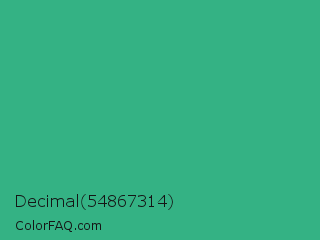 Decimal 54867314 Color is a normal green color and the nearest color is Mint #3eb489. Hex code #34b284 and RGB value is rgb(52,178,132). In RGB color space, this color is composed of 20% red, 70% green, 52% blue, In CMYK color space, this color is composed of 71% cyan, 0% magenta, 26% yellow , 30% black , In HSL color space, this color has a hue angle of 158° , 55% saturation and 45% lightness.