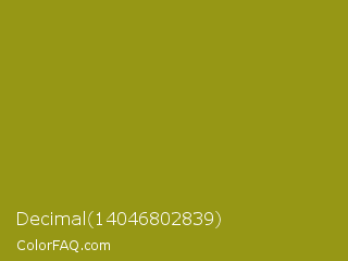 Decimal 14046802839 Color is a normal yellow color and the nearest color is Dark Yellow #9b870c. Hex code #969715 and RGB value is rgb(150,151,21). In RGB color space, this color is composed of 59% red, 59% green, 8% blue, In CMYK color space, this color is composed of 1% cyan, 0% magenta, 86% yellow , 41% black , In HSL color space, this color has a hue angle of 60° , 76% saturation and 34% lightness.