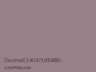 Decimal 14047195488 Color is a normal rose color and the nearest color is Mountbatten Pink #997a8d. Hex code #978088 and RGB value is rgb(151,128,136). In RGB color space, this color is composed of 59% red, 50% green, 53% blue, In CMYK color space, this color is composed of 0% cyan, 15% magenta, 10% yellow , 41% black , In HSL color space, this color has a hue angle of 339° , 10% saturation and 55% lightness.