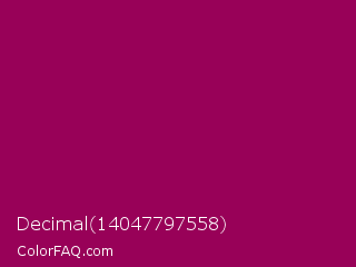 Decimal 14047797558 Color is a dark magenta color and the nearest color is Cardinal Pink #8c055e. Hex code #980158 and RGB value is rgb(152,1,88). In RGB color space, this color is composed of 60% red, 0% green, 35% blue, In CMYK color space, this color is composed of 0% cyan, 99% magenta, 42% yellow , 40% black , In HSL color space, this color has a hue angle of 325° , 99% saturation and 30% lightness.