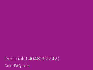 Decimal 14048262242 Color is a normal magenta color and the nearest color is Violet Eggplant #991199. Hex code #991986 and RGB value is rgb(153,25,134). In RGB color space, this color is composed of 60% red, 10% green, 53% blue, In CMYK color space, this color is composed of 0% cyan, 84% magenta, 12% yellow , 40% black , In HSL color space, this color has a hue angle of 309° , 72% saturation and 35% lightness.