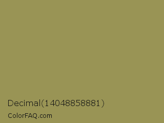 Decimal 14048858881 Color is a normal yellow color and the nearest color is Barley Corn #a68b5b. Hex code #999455 and RGB value is rgb(153,148,85). In RGB color space, this color is composed of 60% red, 58% green, 33% blue, In CMYK color space, this color is composed of 0% cyan, 3% magenta, 44% yellow , 40% black , In HSL color space, this color has a hue angle of 56° , 29% saturation and 47% lightness.