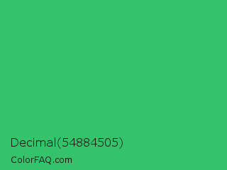 Decimal 54884505 Color is a normal green color and the nearest color is UFO Green #3cd070. Hex code #34c36b and RGB value is rgb(52,195,107). In RGB color space, this color is composed of 20% red, 76% green, 42% blue, In CMYK color space, this color is composed of 73% cyan, 0% magenta, 45% yellow , 24% black , In HSL color space, this color has a hue angle of 143° , 58% saturation and 48% lightness.