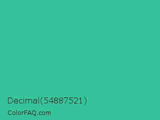 Decimal 54887521 Color is a normal green color and the nearest color is Shamrock #33cc99. Hex code #34c59d and RGB value is rgb(52,197,157). In RGB color space, this color is composed of 20% red, 77% green, 62% blue, In CMYK color space, this color is composed of 74% cyan, 0% magenta, 20% yellow , 23% black , In HSL color space, this color has a hue angle of 163° , 58% saturation and 49% lightness.