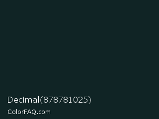 Decimal 878781025 Color is a very dark cyan color and the nearest color is Dark Jungle Green #1a2421. Hex code #102425 and RGB value is rgb(16,36,37). In RGB color space, this color is composed of 6% red, 14% green, 15% blue, In CMYK color space, this color is composed of 57% cyan, 3% magenta, 0% yellow , 85% black , In HSL color space, this color has a hue angle of 183° , 40% saturation and 10% lightness.