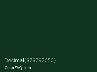 Decimal 878797650 Color is a very dark green color and the nearest color is Phthalo Green #123524. Hex code #103420 and RGB value is rgb(16,52,32). In RGB color space, this color is composed of 6% red, 20% green, 13% blue, In CMYK color space, this color is composed of 69% cyan, 0% magenta, 38% yellow , 80% black , In HSL color space, this color has a hue angle of 147° , 53% saturation and 13% lightness.