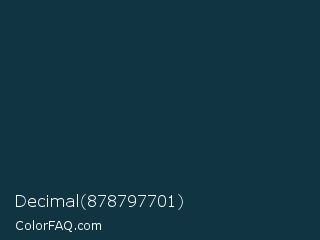 Decimal 878797701 Color is a very dark blue color and the nearest color is Elephant #123447. Hex code #103441 and RGB value is rgb(16,52,65). In RGB color space, this color is composed of 6% red, 20% green, 25% blue, In CMYK color space, this color is composed of 75% cyan, 20% magenta, 0% yellow , 75% black , In HSL color space, this color has a hue angle of 196° , 60% saturation and 16% lightness.